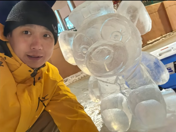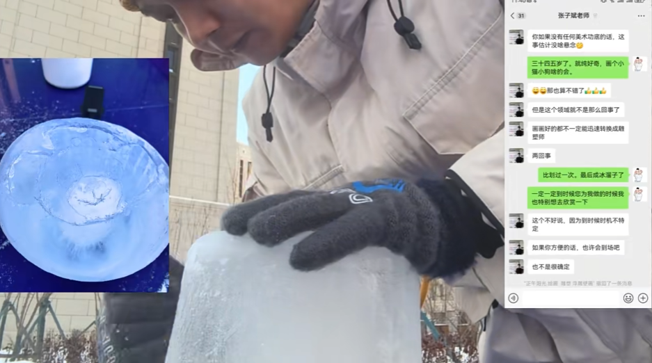 最终,大飞在冰雕老师的指导下,也把雪莉玫形象的冰雕做得有模有样了。